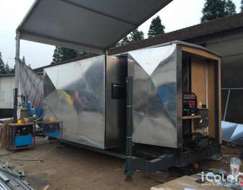 房車外形——車廂表皮采用多面拼接,灰白色鋼板使車體形似石塊,置于草原荒漠之中也顯得和諧而醒目