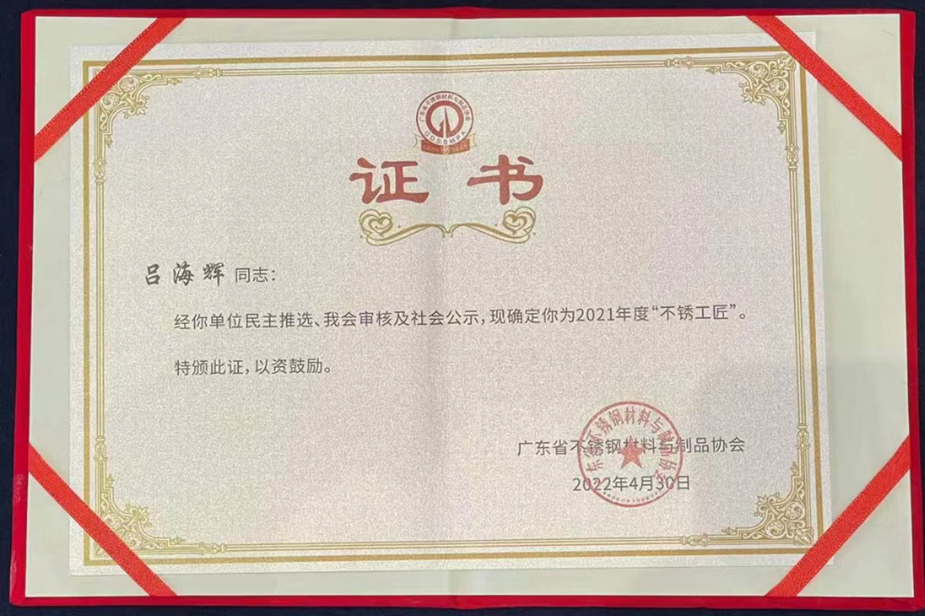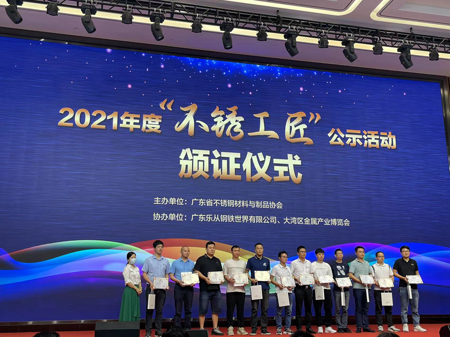 6月15日下午,由廣東省不銹鋼材料與制品協(xié)會(huì)舉辦的2021年度“不銹工匠”公示活動(dòng)頒證儀式在理事單位樂從鋼鐵世界總部大樓多功能會(huì)議廳舉行。本次公益活動(dòng)旨在進(jìn)一步貫徹落實(shí)省委省政府“廣東技工”工程,大力弘揚(yáng)工匠精神,培育選樹一批先進(jìn)榜樣,進(jìn)一步營(yíng)造尊重人才、崇尚技能、追求品質(zhì)的行業(yè)氛圍,持續(xù)擦亮“不銹優(yōu)品·廣東質(zhì)造”的名片。
