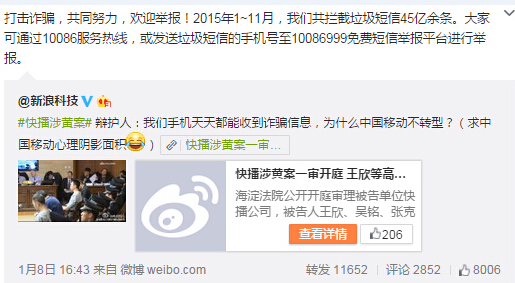 除了互聯(lián)網(wǎng)巨頭,中國(guó)移動(dòng)也成為快播辯護(hù)人用來反駁的說辭。王欣辯護(hù)律師稱:“公訴人老是問快播為什不轉(zhuǎn)型?那就我問問,我們手機(jī)里老是收到詐騙短信,怎么沒讓中國(guó)移動(dòng)轉(zhuǎn)型啊?”此話一出,嚇得中國(guó)移動(dòng)趕忙發(fā)微博: