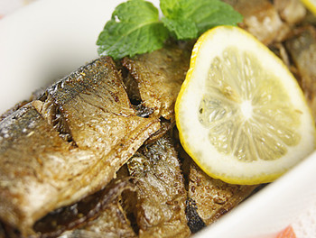 原料:秋刀魚600克、檸檬2片、橄欖油1湯匙、鹽、孜然粉適量