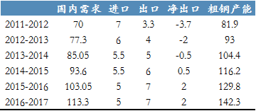 印度十二五計(jì)劃(2012年4月-2017年3月)末期,鋼材年需求將從本財(cái)年(截至2012年3月)的7000萬(wàn)噸增加到1.133億噸,增幅超60%。如果GDP同比增幅保持在9%的話,印度國(guó)內(nèi)鋼材消費(fèi)量將在“十二五”期間同比增長(zhǎng)10.3%。截至2017年3月份,印度國(guó)內(nèi)粗鋼年產(chǎn)能將增加到1.423億噸,當(dāng)前年產(chǎn)能為8190萬(wàn)噸。2016-2017財(cái)年,印度成品材進(jìn)口量將小幅提升至500萬(wàn)噸,出口量將實(shí)現(xiàn)翻番至700萬(wàn)噸。同時(shí),印度將于2014-2015財(cái)年實(shí)現(xiàn)鋼材凈出口,而受印度煉鋼產(chǎn)能的限制,過剩產(chǎn)能有限,因此成品材難實(shí)現(xiàn)大批量出口。如果擴(kuò)產(chǎn)項(xiàng)目能夠如期進(jìn)行,印度產(chǎn)量將能夠正好滿足國(guó)內(nèi)需求,但擴(kuò)產(chǎn)項(xiàng)目一旦推遲進(jìn)行,供需情況將趨緊。