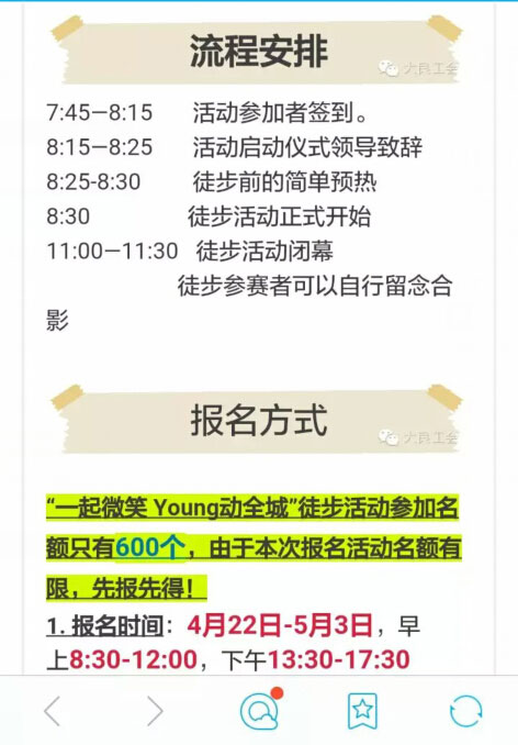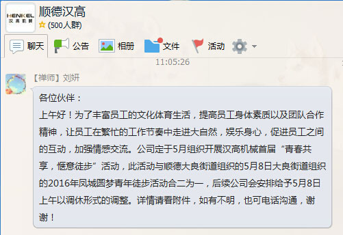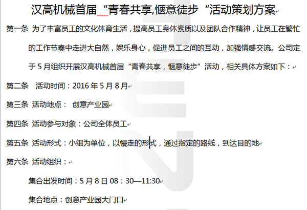 為了豐富員工的文化體育生活,提高員工身體素質(zhì)以及團(tuán)隊(duì)合作精神,讓員工在繁忙的工作節(jié)奏中走進(jìn)大自然,娛樂身心,促進(jìn)員工之間的互動,加強(qiáng)情感交流。公司定于5月組織開展?jié)h高機(jī)械首屆“青春共享,愜意徒步”活動,此活動與順德大良街道組織的5月8日大良街道組織的2016年鳳城圓夢青年徒步活動合二為一,讓我們一起來享受徒步走樂趣。